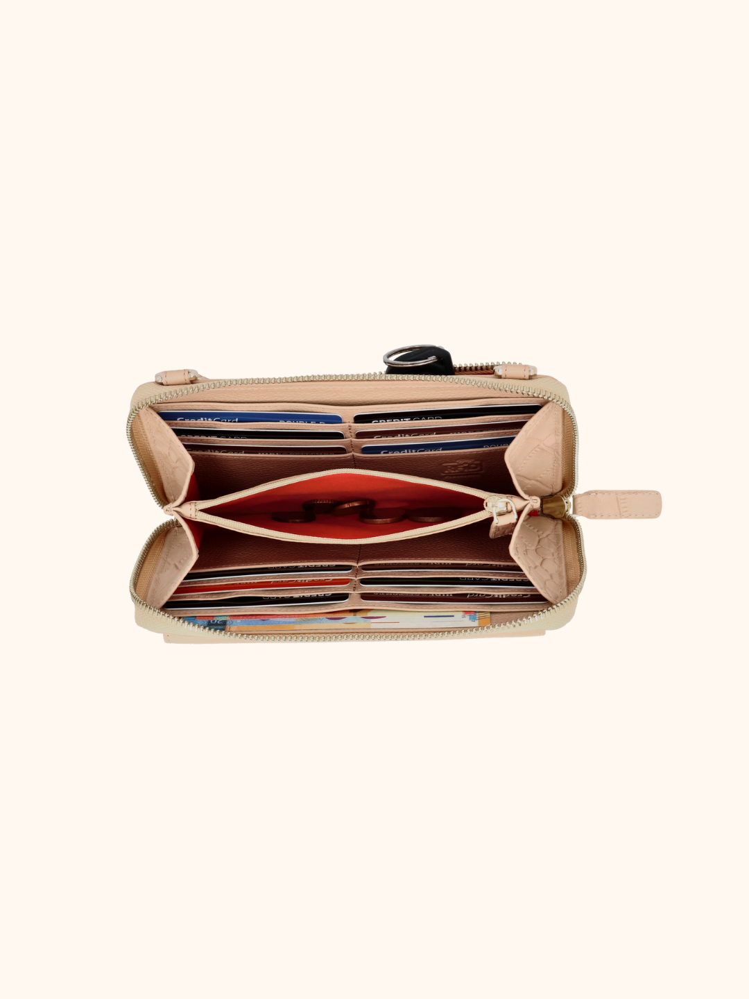- In het middenvak vindt u een ingebouwde portemonnee met extra vakjes voor paspoort en reisdocumenten. Aan de voorkant heeft Christina een speciaal vak voor uw telefoon, en aan de achterkant een handig ritsvak voor sleutels of kleine essentials.