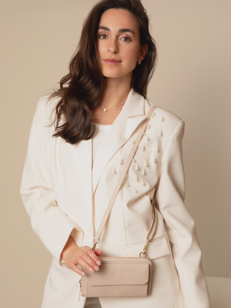 Bescheiden en elegant, de Christina is onze perfect ontworpen kleinste tas waarin je al jouw spullen georganiseerd kan opbergen. De Christina is een telefoontas, portemonnee en crossbodytas in één. Met een ingebouwde portemonnee in het middelste vak met extra vakken voor je paspoort en reisdocumenten. Aan de voorkant zit een speciaal vakje voor je telefoon en aan de achterkant zit een rits waar je sleutels in passen. Jouw perfecte tas voor op reis, festivals, diner of uitgaan.