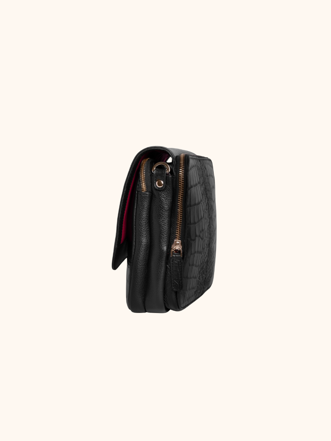 je telefoon in passen. Aan de binnenkant hebben we twee verschillende compartimenten. Eén is speciaal gebouwd om waardevolle bezittingen in op te bergen. De tas heeft een sleutelhaak en een ritssluiting. Aan de voorkant heb