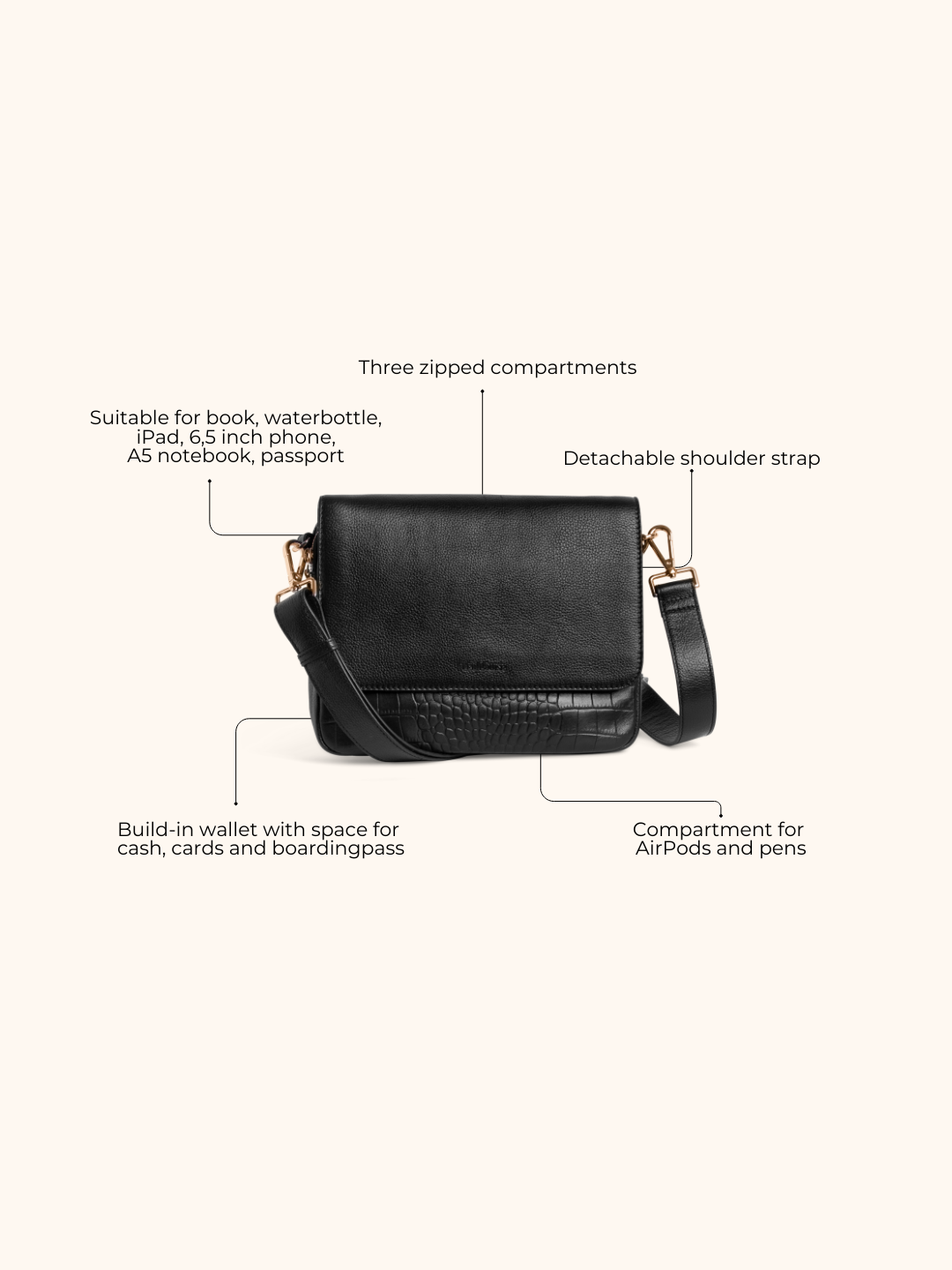 - Fits a book, iPad or e-reader, a 500 ml water bottle, pens and AirPods