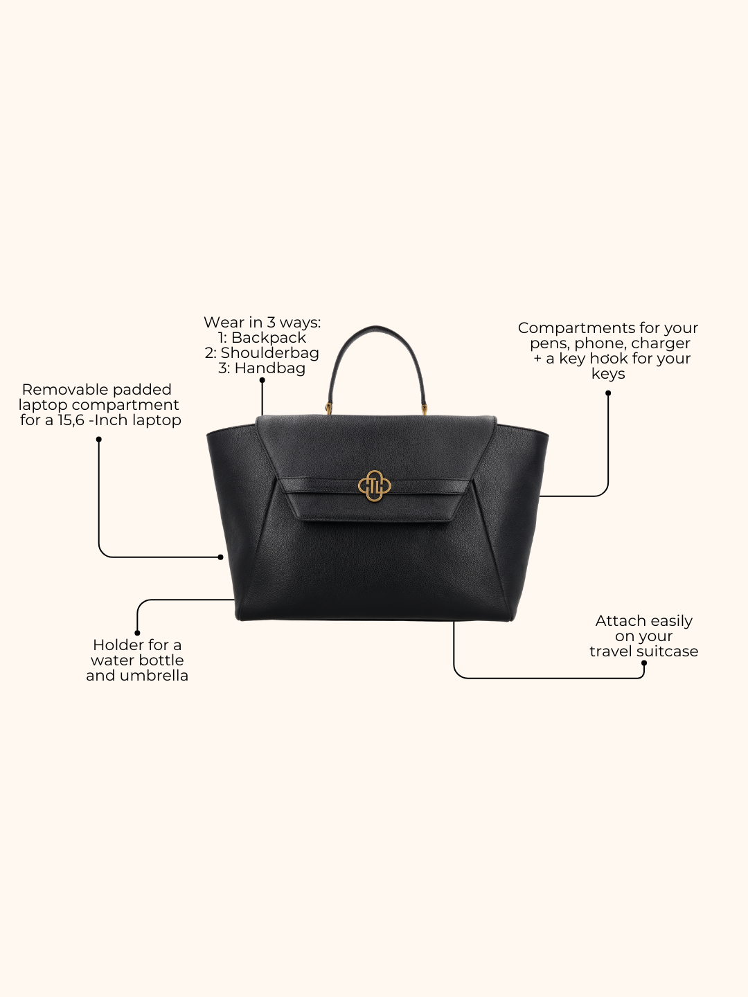 • Wear it your way: as a handbag, a shoulderbag or backpack