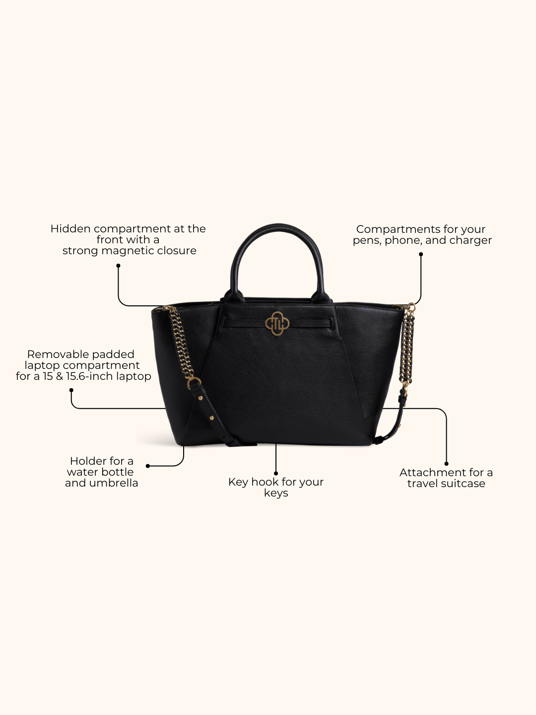 You’ll never misplace your keys thanks to the elegant keychain strap, and a hidden front pocket with magnetic closure offers quick access to essentials. The removable laptop sleeve makes the Nikki as versatile as it is stylish: the perfect workbag that effortlessly transforms into an everyday handbag.
