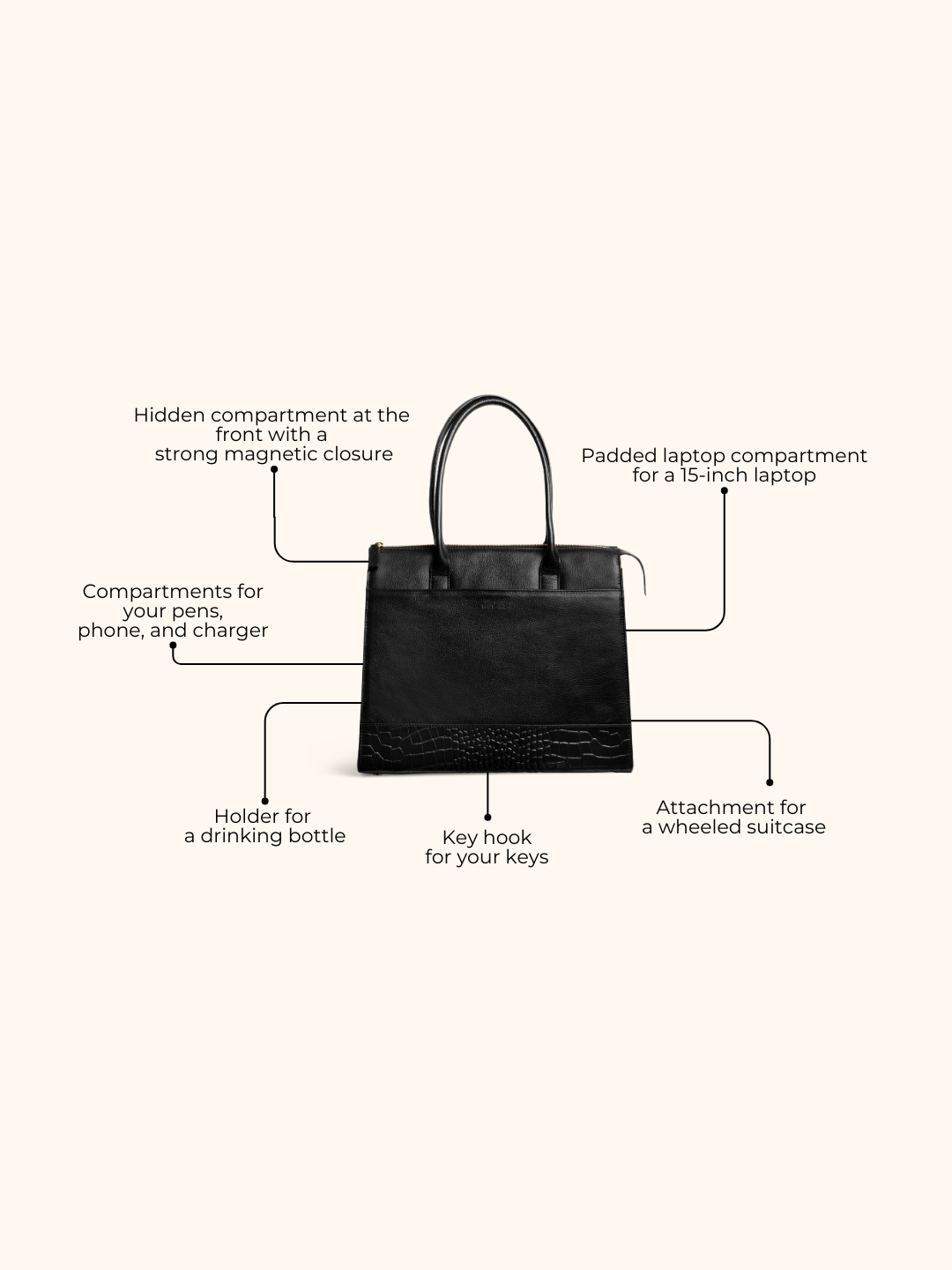 With the Jordan laptop bag, you go to your busy office life in style. The Jordan is organized, elegant, classic, and not only looks beautiful but is also very functional. It is so well organized on the inside that you will never have to look for anything. On the outside is a hidden front pocket, which fits documents. And if you are on a trip and don't feel like carrying the bag: the Jordan can be attached to the handle of the trolly, so you can just push it around.